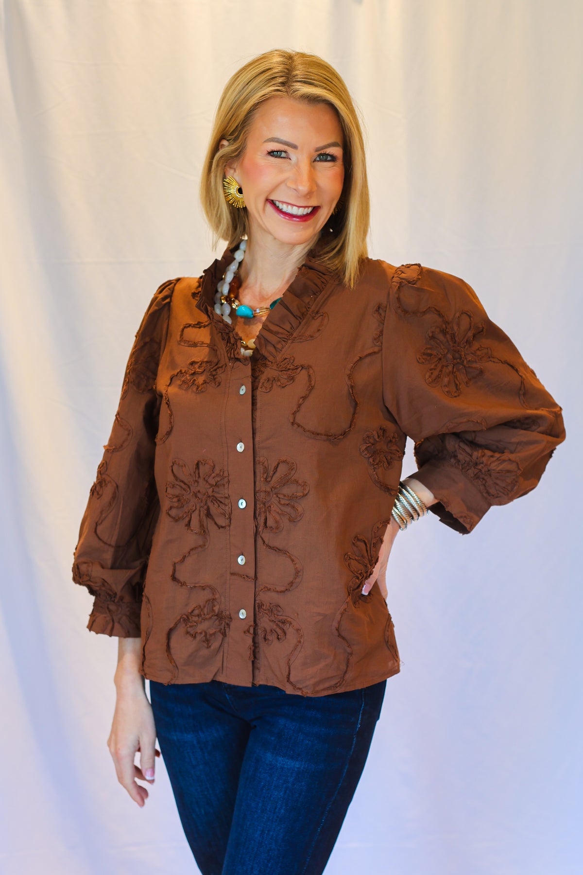 - Warm chestnut brown cotton blouse with raised floral texture throughout.