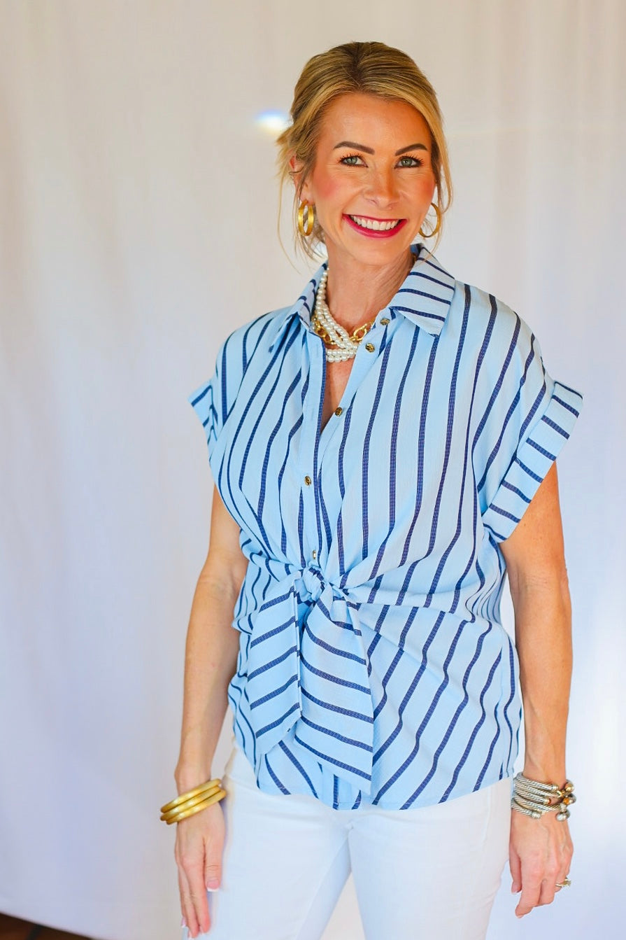 The Bethany Stripe Blouse - Blue feels fresh and coastal-inspired. The soft stripe keeps it classic, while the tailored collar and waist tie elevate the silhouette. It’s crisp, flattering, and effortlessly polished for workdays, weekends, and everything in between.