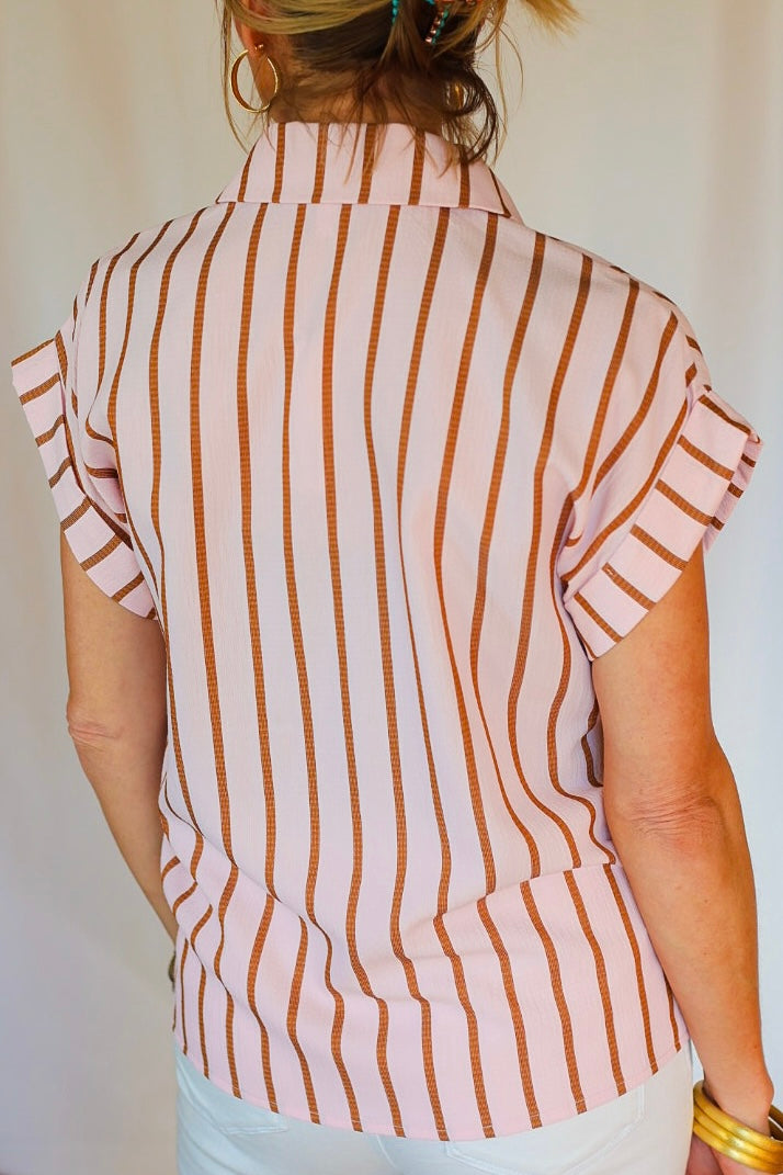 The Bethany Stripe Blouse - Pink adds a soft feminine pop to a structured silhouette. The vertical stripe keeps it refined, while the tie waist creates shape without sacrificing comfort. It’s playful, polished, and perfect for brightening up your everyday wardrobe.