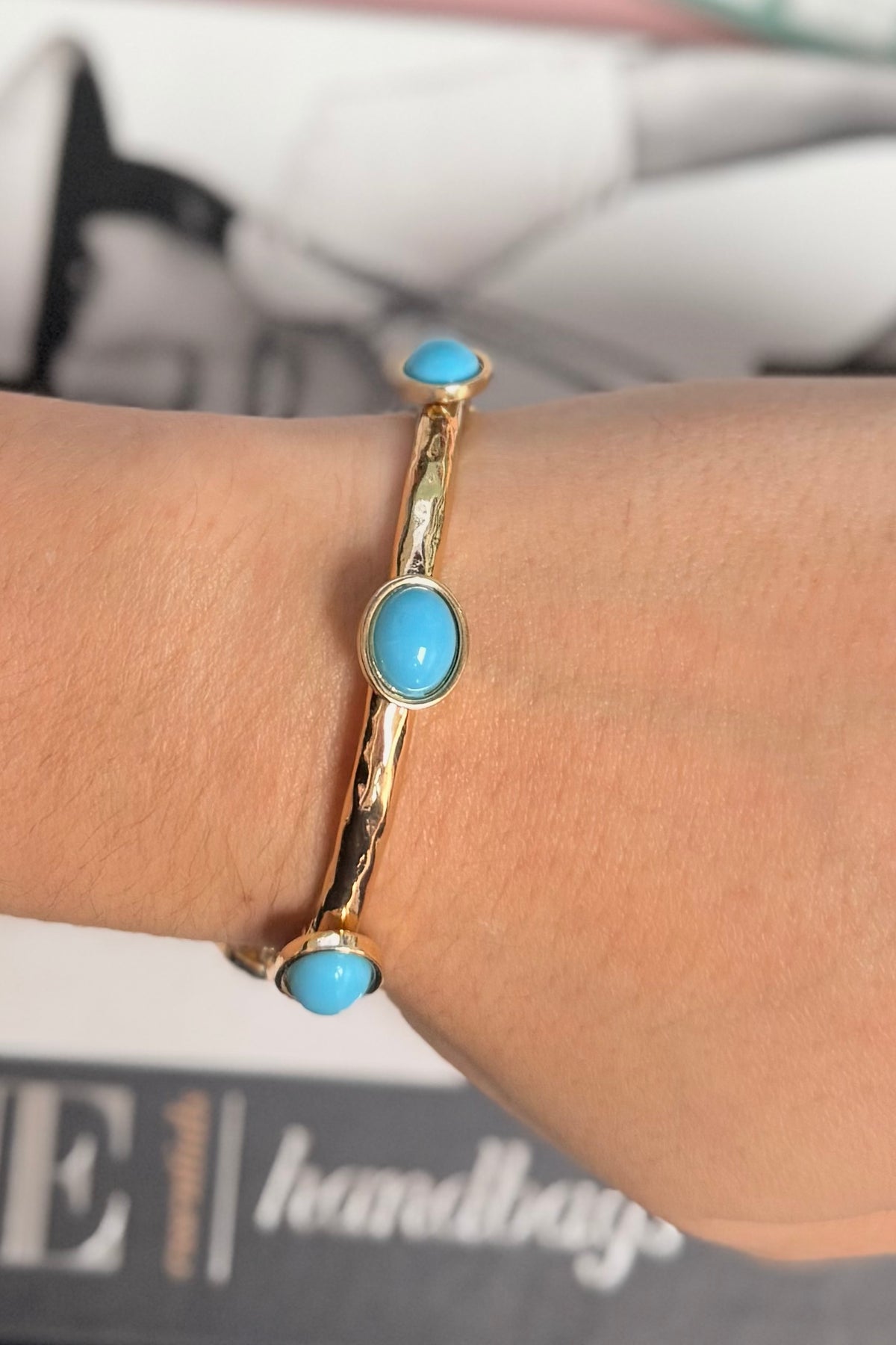 The Lila Gem Bangle brings a chic pop of color and shine to your everyday stack. Each gold-dipped hammered band features a single bezel-set stone—available in pearl, ruby, clear crystal, turquoise, and more—making every bracelet uniquely eye-catching. Lightweight and perfect for layering, Lila adds effortless elegance whether worn solo or styled in a bold, colorful stack.