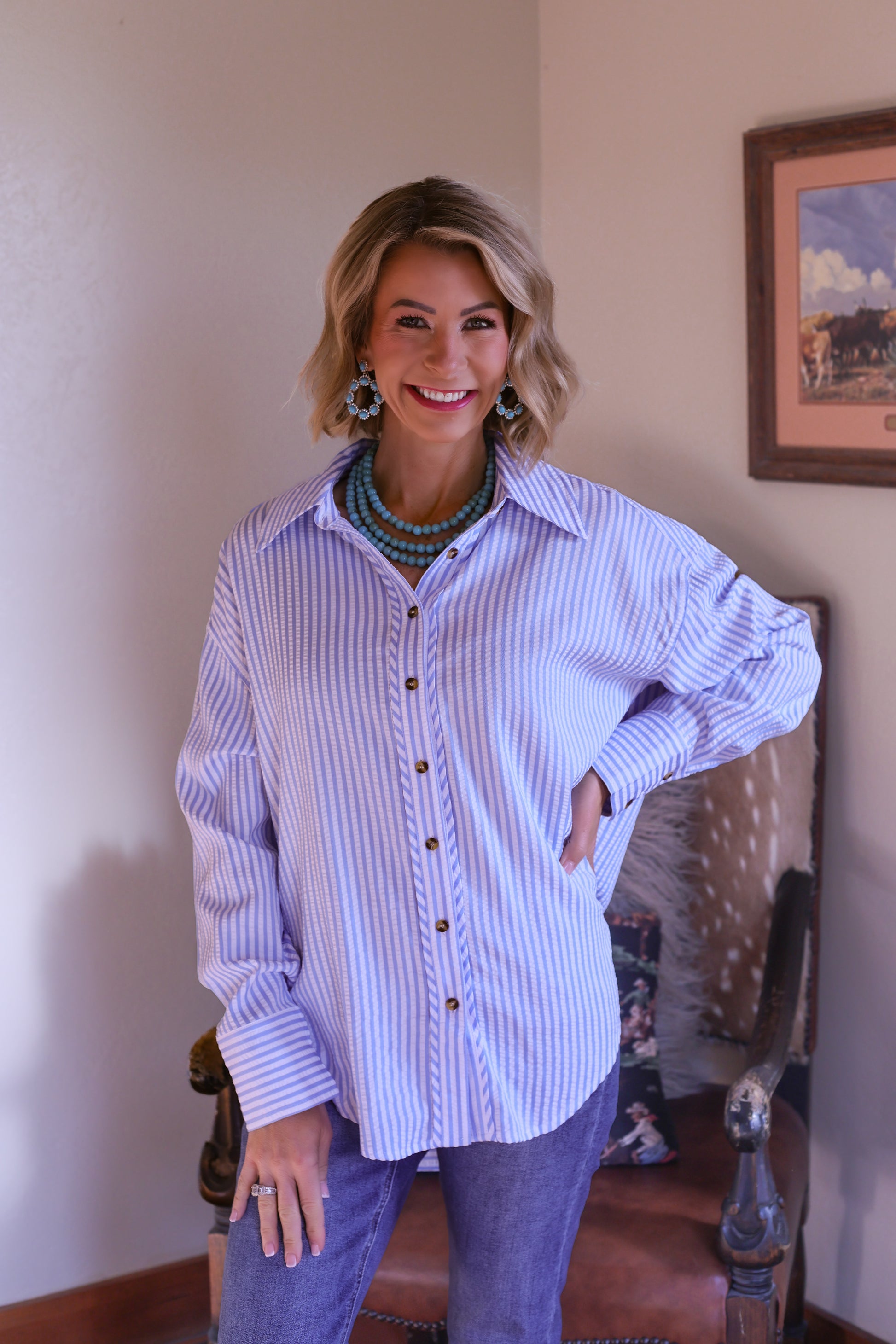 The Bluebell Stripe Button-Up is a timeless closet staple with an effortless feel. The soft stripe pattern keeps it classic while the relaxed fit makes it easy to style for workdays, weekends, or layered looks. Perfect with denim, white pants, or worn open over a tank for an easy polished outfit.