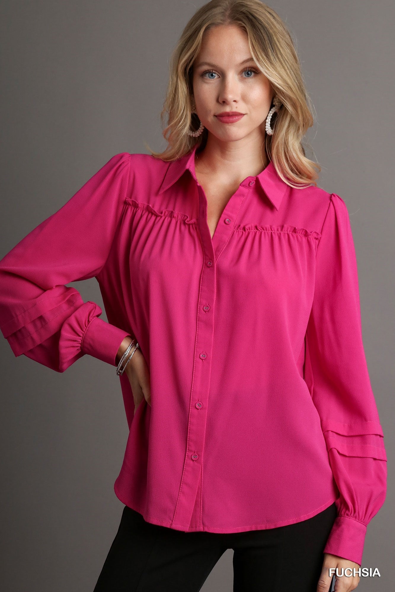 This Button Down Ruffle Long Sleeve Top adds a touch of femininity with its ruffle details. Available in fuchsia and brown, it offers a stylish and versatile addition to any wardrobe! Elevate any outfit with this must-have piece!