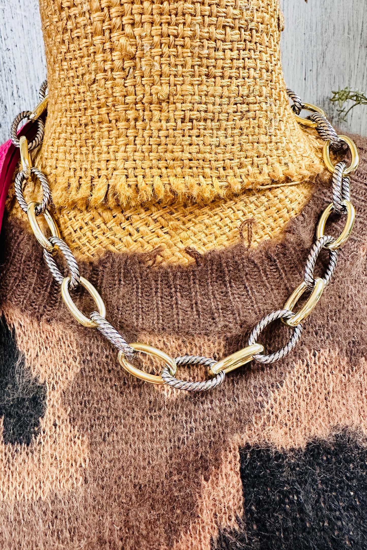 Elevate your style with our Luxe Link Necklace. Its stunning mix of metals creates a statement piece that will add a touch of luxury to any outfit. Perfect for any occasion, this boutique accessory is sure to impress.