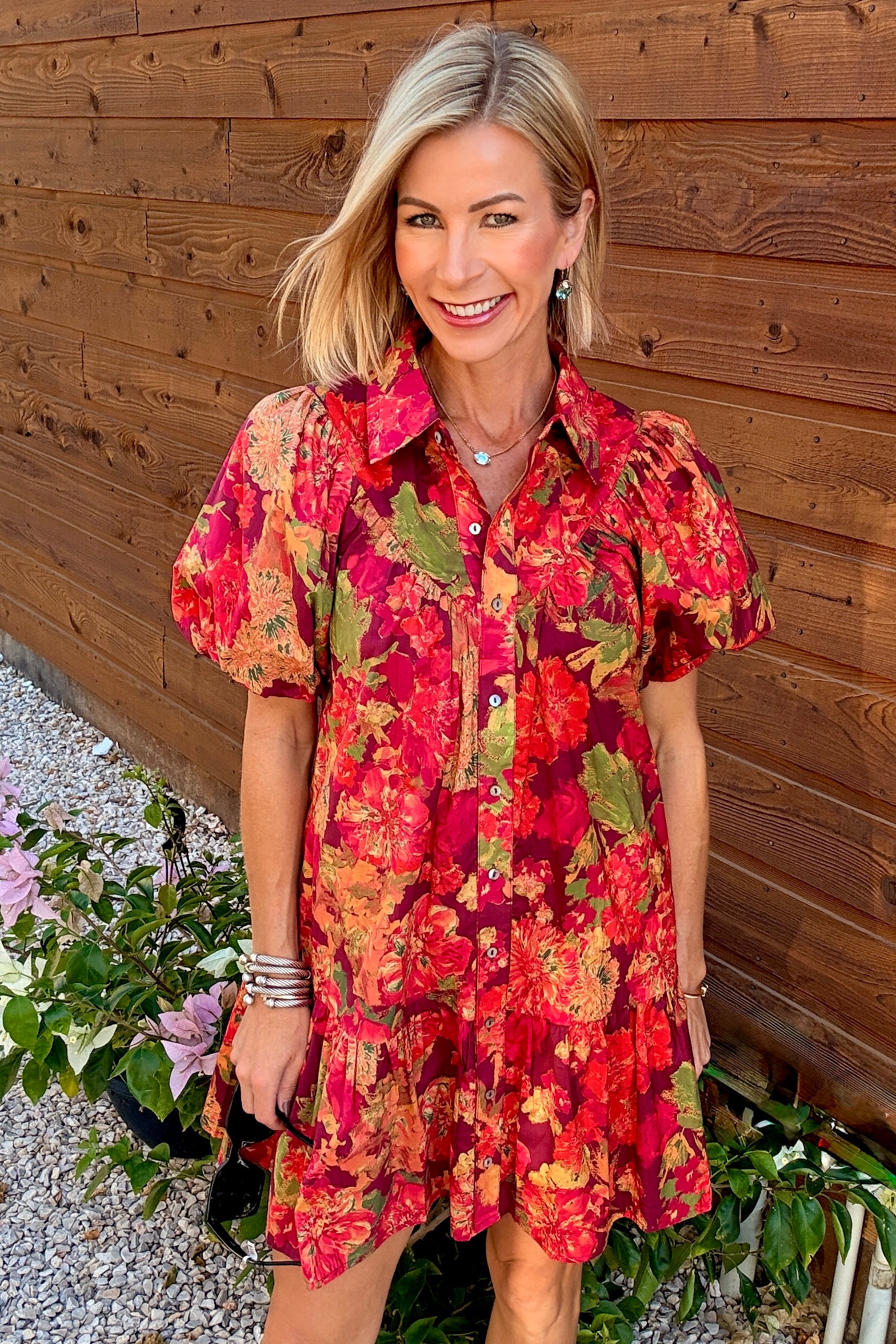 Turn heads in the Sunset Bloom Dress, a vibrant floral statement piece bursting with shades of red, coral, and golden tones. Featuring playful puff sleeves, a tiered babydoll silhouette, and a button-up neckline, this dress combines comfort with bold, eye-catching style. Perfect for brunch dates, vacations, or any day you want to add a pop of color, it’s the ultimate blend of fun and feminine flair!