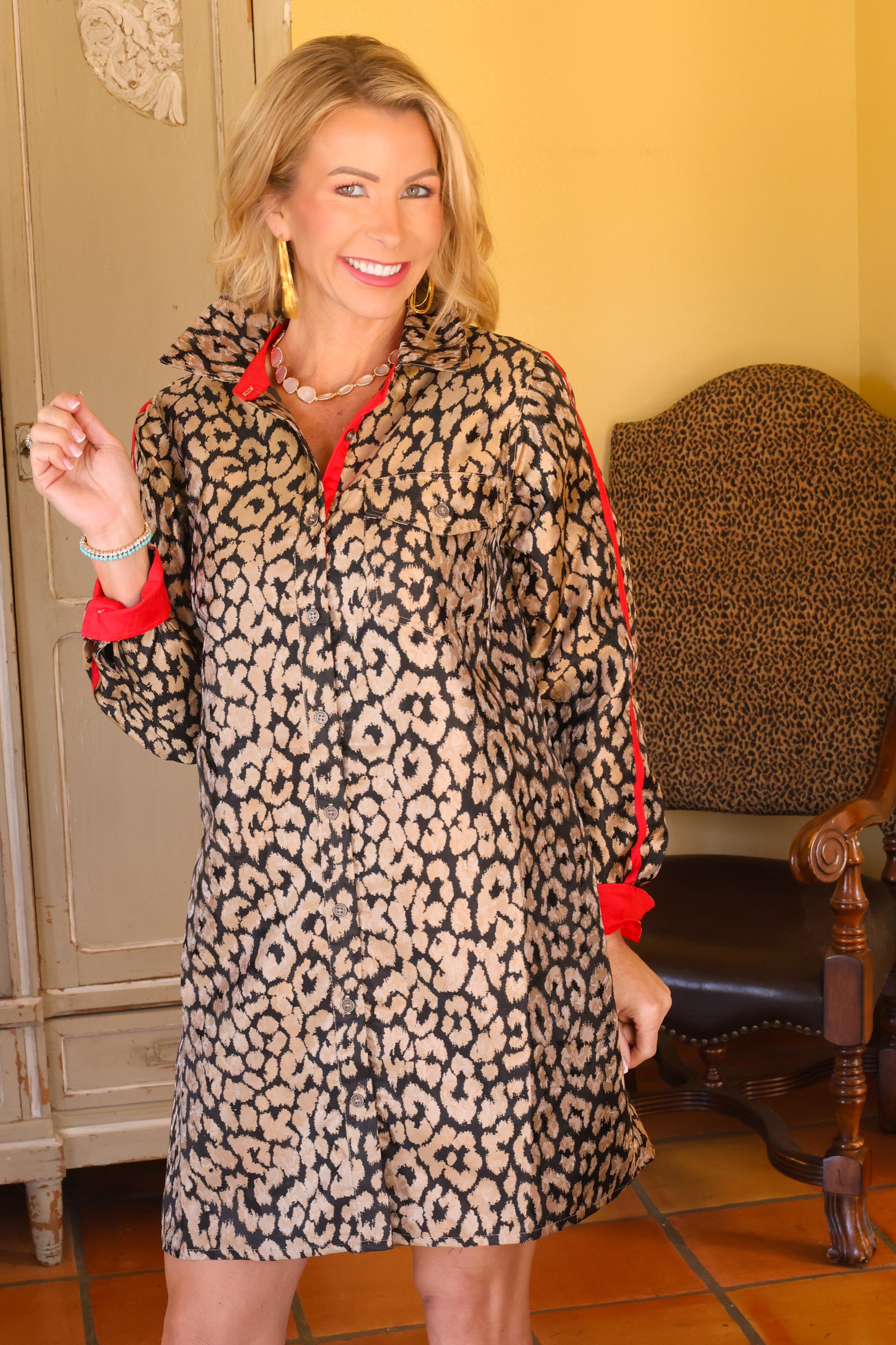 The Brinley Dress delivers bold personality with its chic leopard print and unexpected pop of red detailing that instantly elevates the entire look. Designed in a relaxed shirt-dress silhouette, it offers the perfect blend of comfort and standout style. Pair it with sneakers for daytime errands or dress it up with boots for a night out—The Brinley Dress is effortlessly fun, fierce, and fashion-forward.
