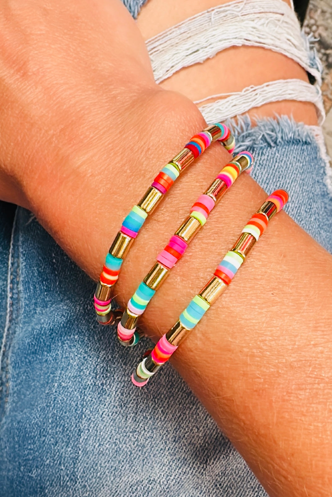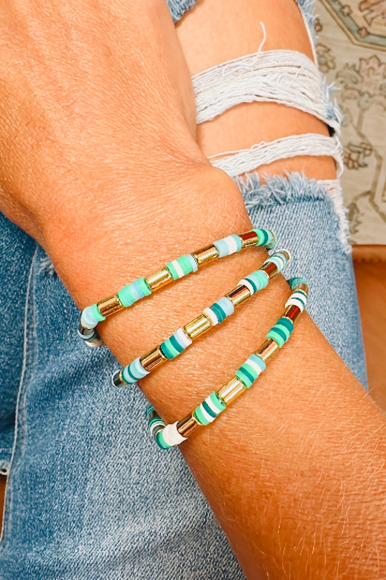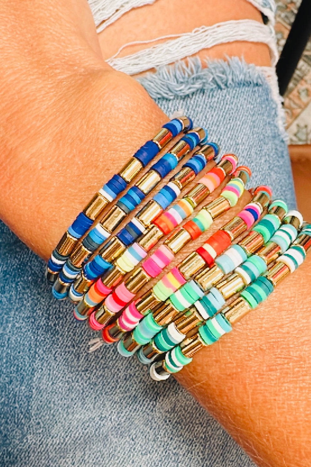 The candy shack bracelets are so fun, they come in a multi colored, green and blue stack.