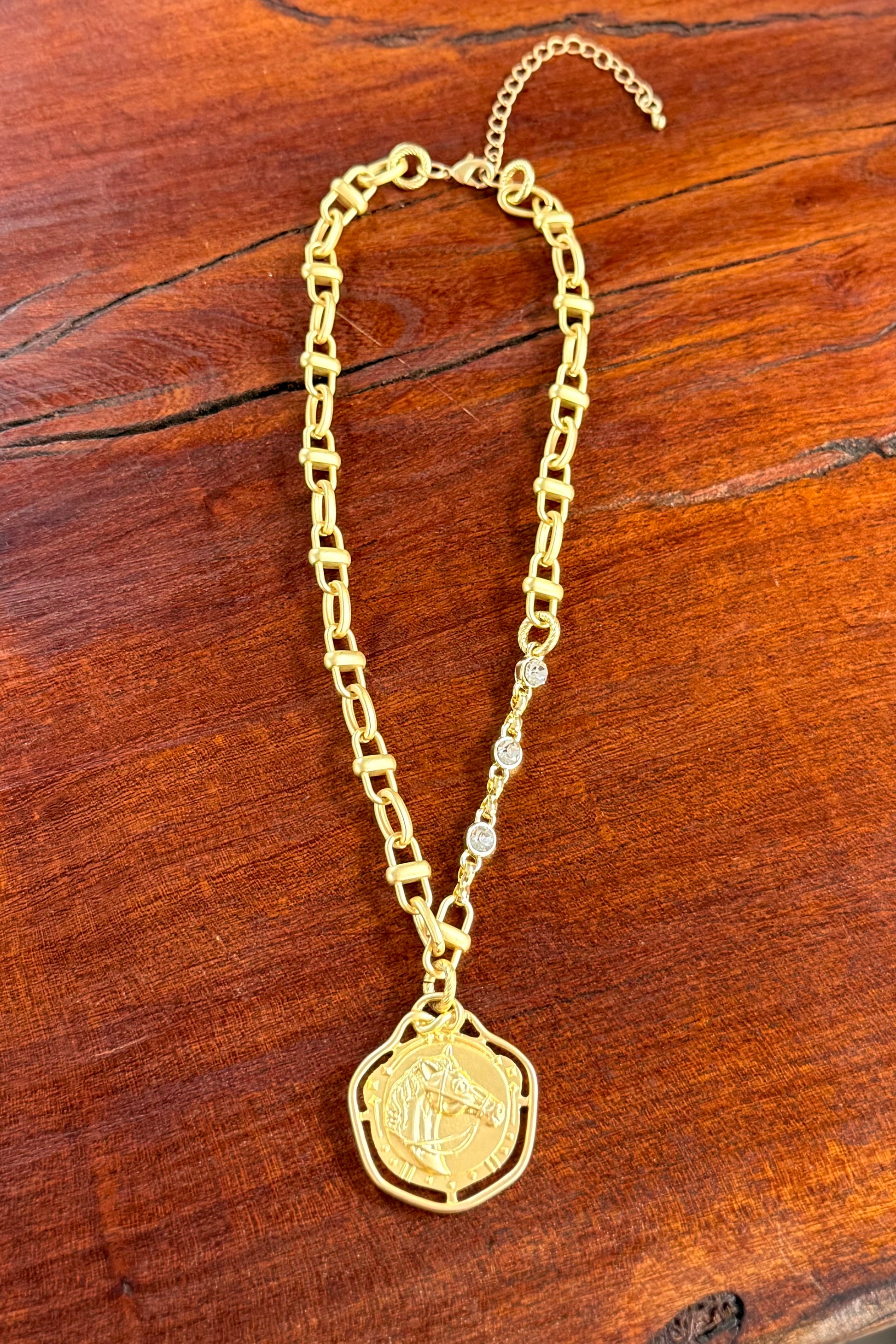 Handcrafted with intention, the Emerson Pendant Necklace features a radiant gold chain and a detailed horse medallion that symbolizes freedom and poise. Accented with subtle crystal stations, this necklace adds depth and personality to any look—timeless, confident, and beautifully distinctive.