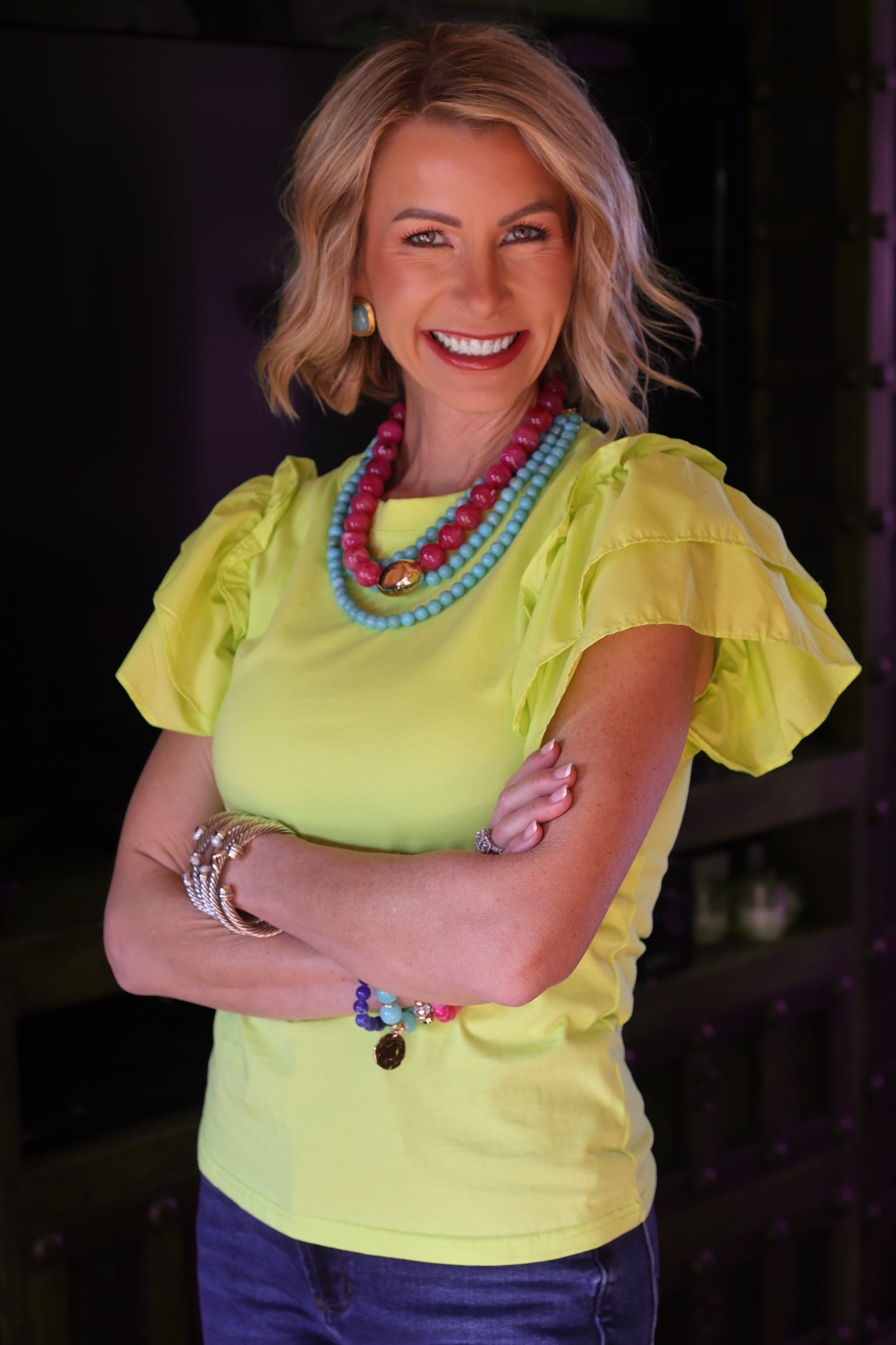 The Laken Ruffle Tee brings a fresh pop of color with an effortlessly chic silhouette. Featuring playful ruffle sleeves and a clean, relaxed fit, this lime tee is an easy statement piece that pairs perfectly with denim, white bottoms, or layered looks for a bright, boutique-ready outfit.