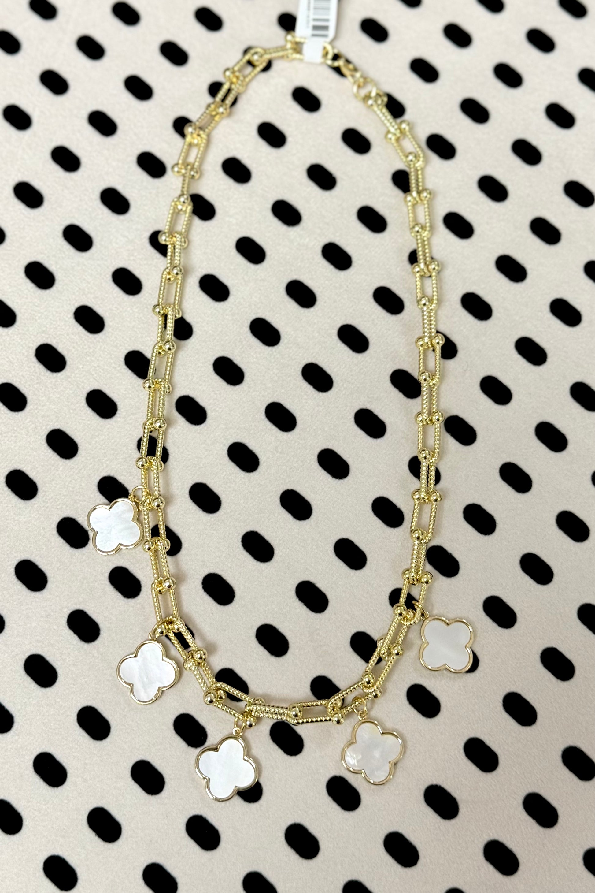 Elevated elegance with a playful twist—the Marbella Clover Necklace features a textured gold link chain adorned with luminous mother-of-pearl clover charms. Adjustable at 16–18 inches, this piece layers beautifully or makes a statement all on its own. A timeless symbol of luck and style, perfect for day-to-night chic