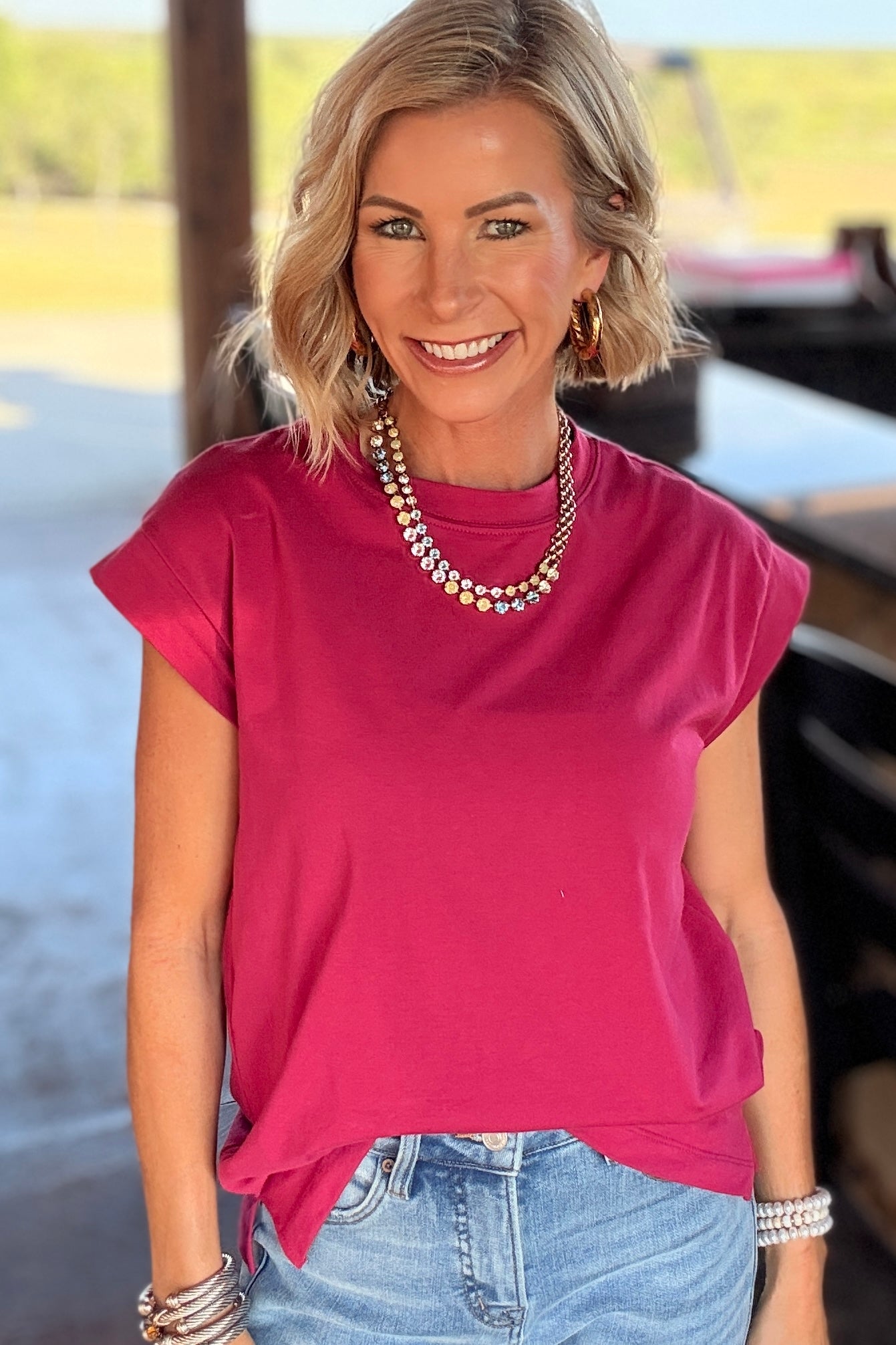 The Mila Rolled Sleeve Tee is your pop of color for every season. With its bold magenta hue, cuffed sleeves, and relaxed fit, it’s both chic and comfortable. Perfect for pairing with denim, layering under a blazer, or tucking into skirts, this versatile tee instantly elevates your everyday look.