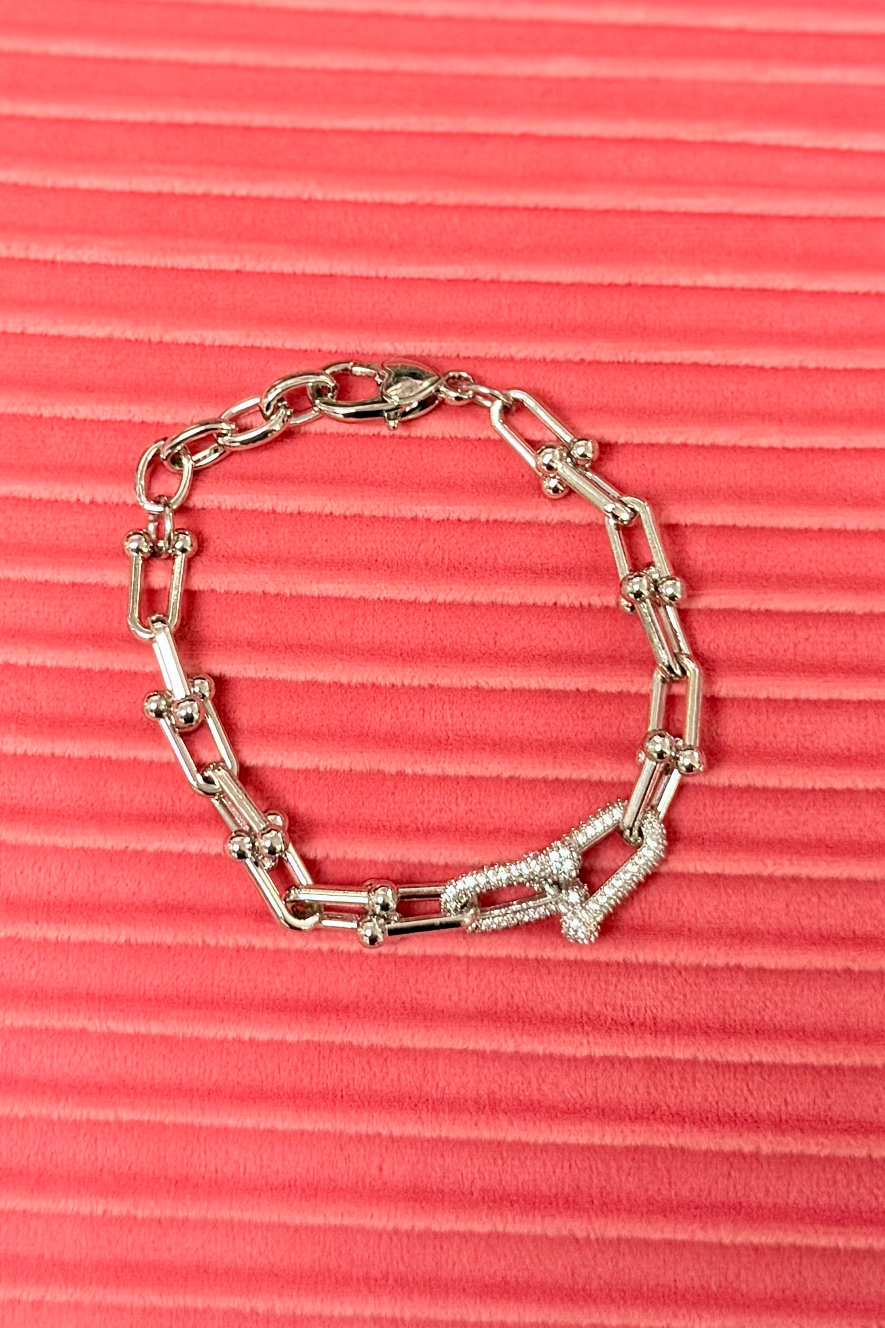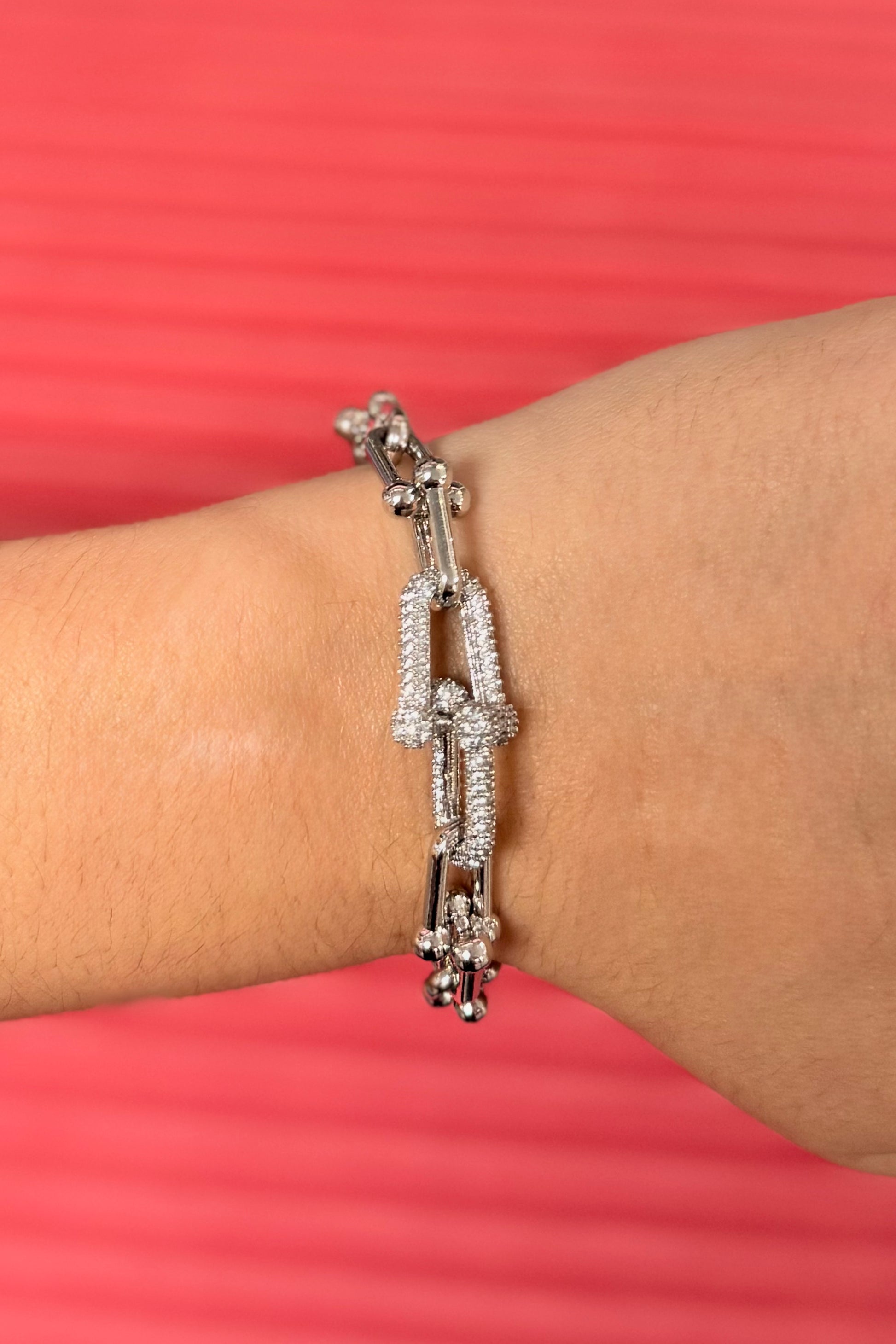 Edgy yet refined, the Manhattan Link Bracelet features bold silver links accented with polished spheres and a sparkling pave clasp. Its clean lines and modern design make it the perfect statement piece for layering or wearing solo.