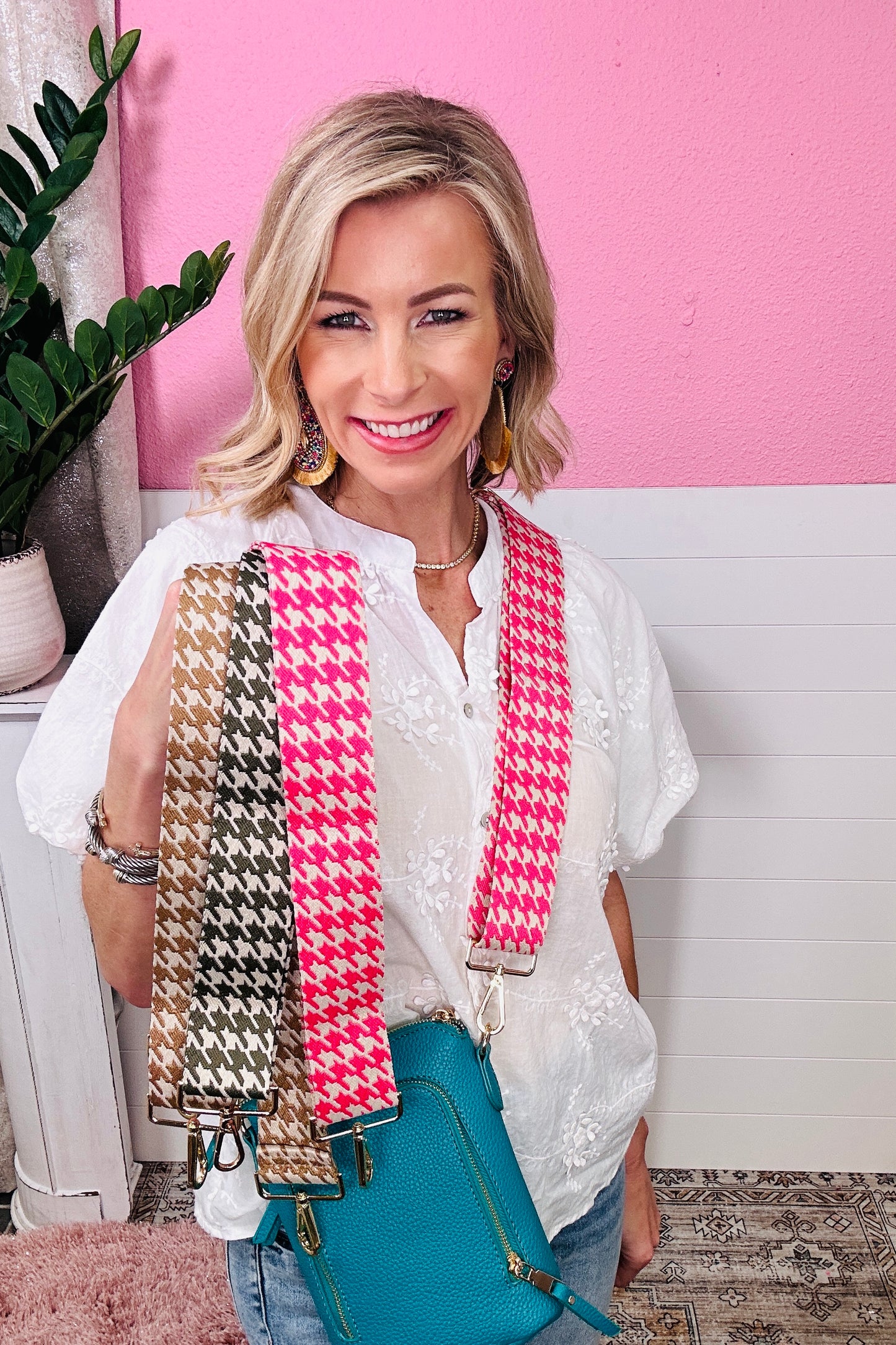 Introducing the Val Purse Strap - a stylish and versatile addition to your purse collection. Available in tan, dark green, and pink, its geometric design adds a unique touch to any outfit. Switch up your look effortlessly with this trendy strap.